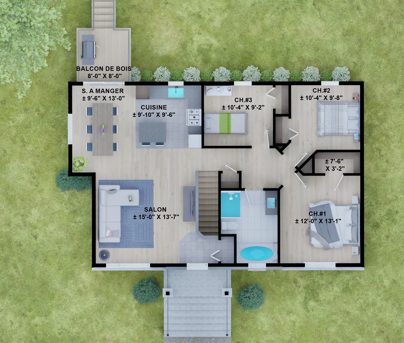 Dotée d’un porche imposant surplombant l’entrée et soutenu par de hautes colonnes de pierres incrustées de bois, cette maison de plain-pied cache un intérieur lumineux et bien pensé. Comme toujours, les couleurs et la disposition peuvent être modifiées selon vos préférences.